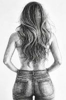 Deze betoverende zwart-wit illustratie toont een jonge vrouw met lang haar die zelfverzekerd poseert in een stijlvolle spijkerbroek. Haar pose straalt zowel allure als een subtiele, mysterieuze elegantie uit die de aandacht trekt. Met duidelijke lijnen en arceringen benadrukt de illustratie haar gracieuze houding en geeft haar een…