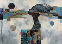 Vrouw met Abstracte Achtergrond - In dit abstract schilderij zie je een vrouw met een lange haarstijl, waarvan de contouren en kleuren in een combinatie van zwart, turquoise en gouden details mooi naar voren komen, tegen een achtergrond van zachte, lichte tinten en geometrische vormen.