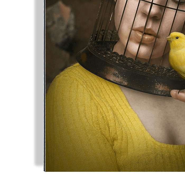 Koop dit vogel kunstwerk Vrouw met Vogelkooi en Kanarie in de kolenmijn - Symboliek van Mens en Natuur van Elianne van Turennout op canvas, aluminium dibond, (ingelijste) fotoprint, behang en ArtFrame, op maat geprint in Fine-Art kwaliteit.