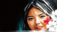 Digitaal schilderij van een mooie Zuidoost-Aziatische vrouw met delicate bloemen in haar haar. Haar zachte glimlach geeft het portret een rustige elegantie, terwijl een vleugje groenblauw licht haar gezicht benadrukt tegen de donkere achtergrond.