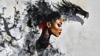 Digitale illustratie van een krachtige zwarte vrouw met felrode lippenstift die sierlijk poseert naast een draak verstrengeld in haar haar. De scène straalt magie, elegantie en kracht uit, terwijl de eenvoudige witte achtergrond de aandacht vestigt op de betoverende afbeelding van de vrouw en de draak. Dit werk combineert mystiek en…