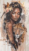 Afrikaanse vrouw met luipaard- hoog en smal kunstwerk.