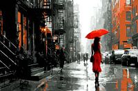 Dit sfeervolle schilderij toont een vrouw in een felrode jurk die met een bijpassende rode paraplu over een natte, glimmende stadsstraat loopt. De regen heeft de straat veranderd in een reflecterend tapijt, dat het licht van de stad en de kleuren van de lucht weerkaatst. Links en rechts staan auto's geparkeerd en op de achtergrond maken…