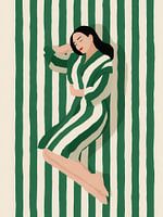 Dit kunstwerk toont een vrouw die in alle rust ligt op een achtergrond van verticale groene en crèmekleurige strepen. Haar houding straalt kalmte uit, alsof ze zich volledig overgeeft aan een moment van stilte. De zachte schaduwen voegen subtiele diepte toe zonder het minimalistische karakter te doorbreken. De kleurvlakken zijn strak en…