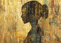 Vrouw profiel - Dit is een vrouwen schilderij van een zijaanzicht met een donker silhouet van een vrouw met knot tegen een ingetogen goud-beige, aardetinten achtergrond met verticale strepen en vervaagde textuur, een modern abstract schilderij, vrouwen schilderij, schilderij vrouw.