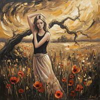 Dit schilderij straalt een intense, dromerige en enigszins melancholische sfeer uit. De vrouwelijke figuur staat centraal in een veld vol rode klaprozen, met achter haar een dramatische lucht waarin dikke penseelstreken de wolken in beweging lijken te zetten. Haar houding is introspectief en poëtisch – de ogen gesloten, de armen boven haar hoofd – alsof ze gevangen is in een moment van stilte, bezinning of emotie. De kleurstelling is warm en contrastrijk, met goud- en okertonen die het hele werk een bijna magische gloed geven.