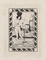 Een vrouw staat naakt naast een pers, een machine verwant aan de techniek uit de boekdruk en ander materiaal uit een drukkerij of verwante grafische industrie.