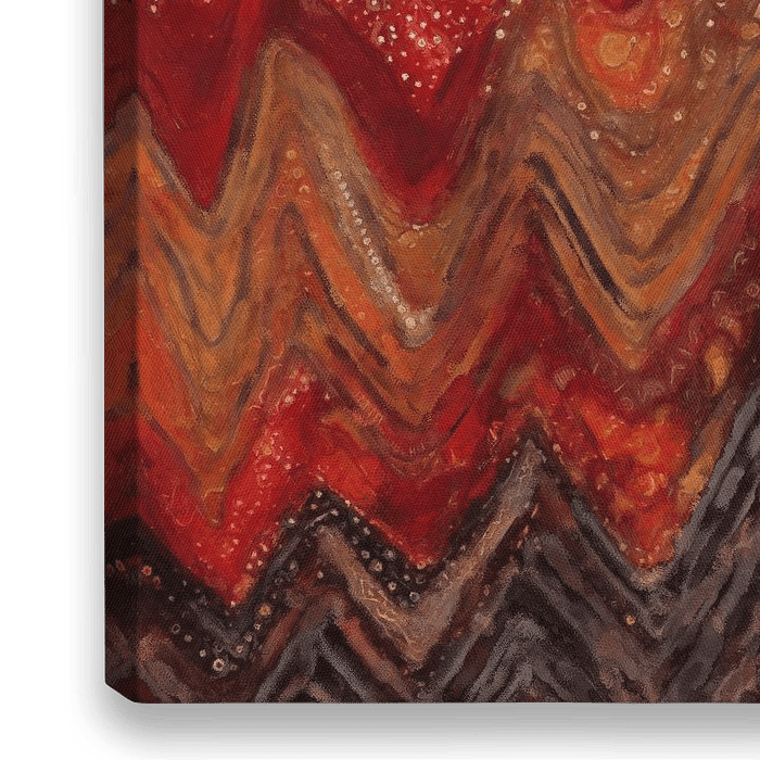Dit werk toont een dynamisch spel van zigzag patronen in vurige tinten van rood, oranje en geel. De levendige kleuren en de golvende lijnen creëren een gevoel van energie en beweging. Door de warme kleuren en complexe texturen lijkt het werk constant in beweging, wat een intens visueel effect geeft. Dit werk is perfect voor een ruimte…