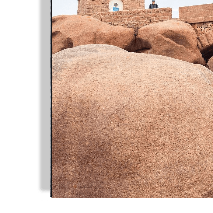 De toren, officieel bekend als Phare de Mean Ruz, markeert een van de meest karakteristieke punten van de Côte de Granit Rose. Zijn kleur en textuur sluiten naadloos aan bij de natuurlijke vormen van het omliggende gesteente. Op de voorgrond liggen massieve, afgeronde rotsen in roze tot roodbruine tinten — gevormd door miljoenen jaren erosie.