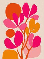 Abstracte compositie van organische bladvormen en ronde elementen in een levendig kleurenpalet van fuchsia, oranje, rood en roze. De vormen zijn gestileerd en overlappen elkaar in transparante lagen, waardoor diepte ontstaat binnen een verder plat vlak. De achtergrond is zacht beige, wat de felle kleuren nog intenser laat…