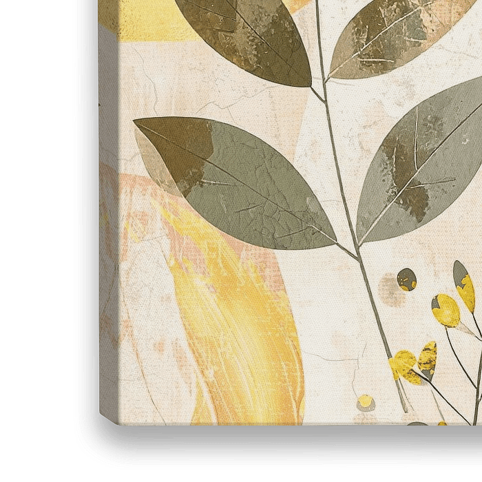 In dit mixed media kunstwerk komen organische plantvormen, zachte kalkstructuren en subtiele bladgoudaccenten samen tot een verfijnde balans tussen natuur en elegantie. De aardse tinten van terracotta, olijfgroen en zandbeige worden doorbroken door gouden…
