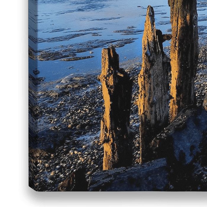 Zonsondergang in maart bij paesens moddergat. De zon schijnt met de allerlaatste lichtstralen nog net langs de rij met verweerde palen. De palen en de stenen zijn nog overblijfselen van een landwinningsproject in de waddenzee.