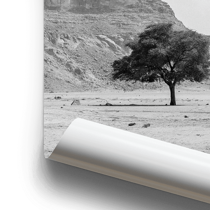 Wadi Rum, gelegen in het zuidwesten van Jordanië, staat bekend om zijn indrukwekkende woestijnlandschappen en majestueuze rotsformaties. Deze foto vangt de serene stilte van de woestijn, waar kamelen rusten onder de schaduw van een eenzame boom, een teken van veerkracht in een van de meest onherbergzame omgevingen ter wereld. Het indrukwekkende berglandschap in de verte benadrukt de grootsheid van de natuur, terwijl de kamelen, die eeuwenlang de woestijnbewoners hebben begeleid, een gevoel van tijdloosheid oproepen. Wadi Rum is niet alleen een populaire bestemming voor avonturiers die de regio te voet, per jeep of met de dromedaris te verkennen, maar ook een plek die wereldwijd bekend is door zijn rol in films zoals Lawrence of Arabia, Dune en Star Wars. De ongerepte schoonheid en de uitgestrekte horizon van de woestijn maken Wadi Rum tot een unieke en magische plek die de ziel raakt. Deze foto is een herinnering aan de ongetemde natuur en de rust die men alleen in zulke verre, ongerepte gebieden kan vinden.