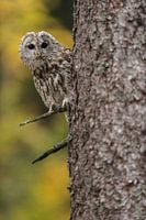 Uil ( Strix aluco ) zit in de herfst in een boom en kijkt met grote ogen nieuwsgierig om de hoek, grappig, kleurrijk plaatje.