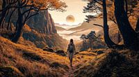 Een jonge vrouw met rugzak en wandelstokken loopt over een pad door een mistige vallei, verlicht door een enorme maan. Omringd door een herfstbos creëren de warme kleuren van de vallende bladeren en de mystieke sfeer van de mist een surrealistische en magische sfeer. Dit beeld vangt de verbinding met de natuur, de geest van avontuur en…