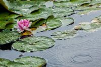 een roze waterlelie contrasterend tegen het groen van de bladeren. De ringen van de regendruppels die in het water vallen breken de rechterzijde van deze foto.