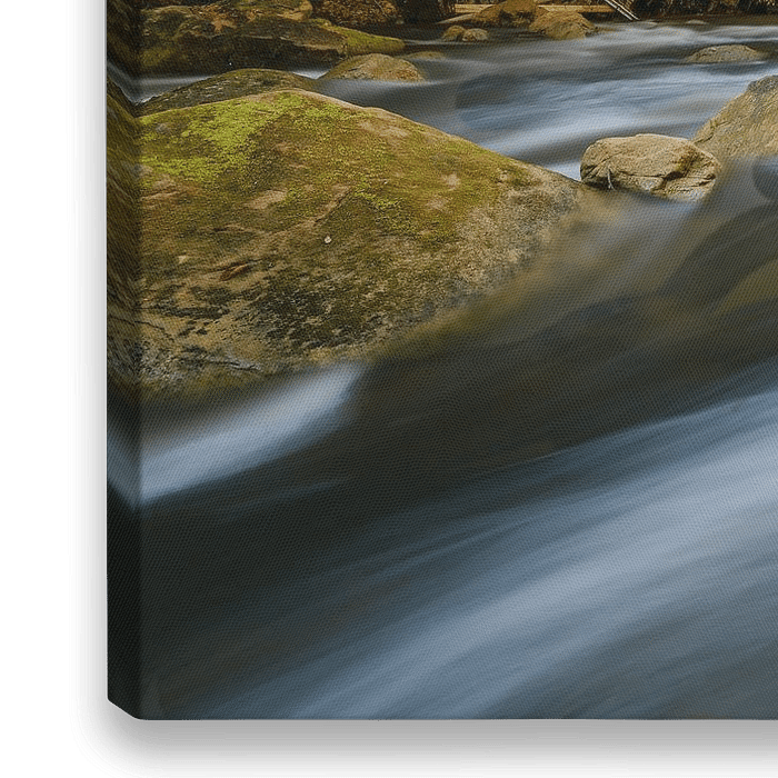 Door de gekozen lange sluitertijd wordt de stroming van het water dat zich om de rotsblokken heen beweegt, goed zichtbaar.