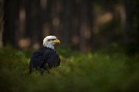 Bald Eagle / Weisskopfseeadler ( Haliaeetus leucocephalus ), watches attentively, sits in spotlight in the undergrowth of dark woods, captive.