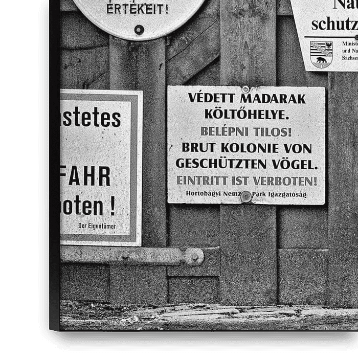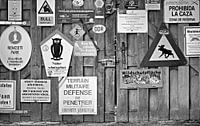 Diverse verbodsborden op een toegangspoort. Ook verkrijgbaar in kleur.
