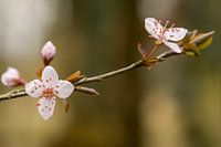 Macro opname van twee roze pruimenbloesems die haarscherp in beeld zijn gebracht. De achtergrond in warme geelgroene kleuren heeft een prachtig bokeh waardoor de bloesems van het beeld af spatten!