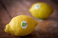 Twee prachtige bio citroenen op tafel als onderdeel van mijn voedsel- en productfotografie activiteiten. Deze waren gewoon zo mooi echt. Niet gekunsteld qua structuur of qua kleur. Gewoon zoals het hoort. Biologisch gekweekt en eerlijk in smaak en uiterlijk.