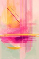 Een hedendaags abstract kunstwerk waarin zachte pasteltinten van roze, geel en mintgroen harmonieus samenvloeien. Strakke geometrische lijnen doorkruisen de compositie en creëren een dynamisch spanningsveld met de vloeiende, transparante kleurvlakken. Het werk straalt een serene, dromerige sfeer uit met een moderne twist.