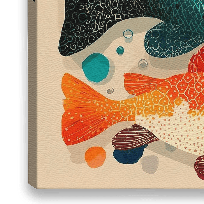 Een levendig kunstwerk van kleurrijke vissen, elk met ingewikkelde patronen en texturen. De vissen zijn in een dynamische compositie gerangschikt en tonen een verscheidenheid aan kleuren. Ze zijn geplaatst tegen een achtergrond met abstracte cirkelvormige elementen verspreid over de afbeelding, wat bijdraagt aan een levendige en speelse…