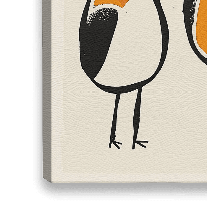 Whimsical Bird Gathering - Dit vogel schilderij toont drie gestileerde vogelfiguren met opvallende oranje en zwarte kleurvlakken tegen een neutrale achtergrond, waarbij de grafische kwaliteit en het scherpe contrast de kunst een levendige en moderne uitstraling geven.