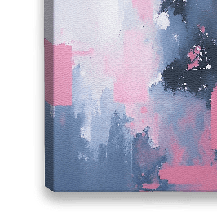In "Whispers of Bloom" vloeien zachte tonen van roze en blauw naadloos samen, als een dromerige ontmoeting tussen ochtendmist en een ontwakende hemel. De abstracte vormen lijken haast willekeurig, maar dragen een subtiele ritmiek, als een stille melodie gevangen in kleur en textuur.