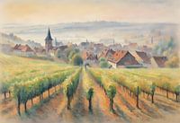 Wijngaarden in de Elzas op een mistige herfstochtend in de eerste zonnestralen in de impressionistische stijl van Camille Pissaro.
