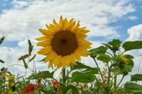 Wilde bloemen onder een mooie zomerlucht, blauwe lucht met wolken. Hier is het accent gelegd op de zonnebloem gefotografeerd tegen de lucht.