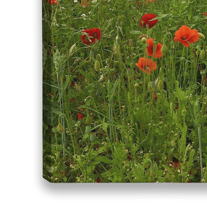 Wilde bloemen in de berm onder een bewolkte zomerlucht. Hier staan met name klaprozen en zonnebloemen.