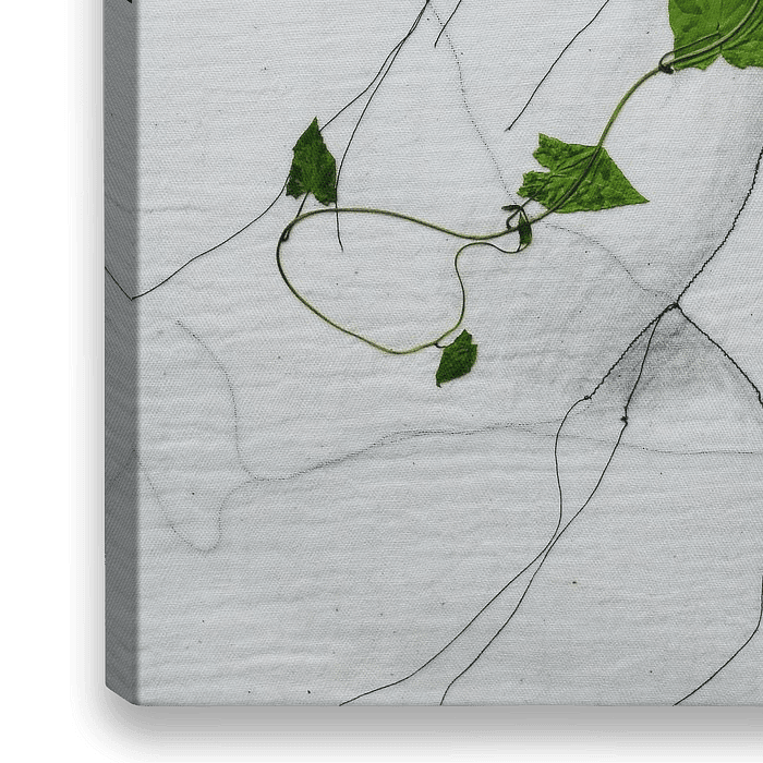Een minimalistisch figuratief werk van zwart draad, houtskool & klimplant op doek. De klimplant en de draden geven een gevoel van vrijheid en beweging.