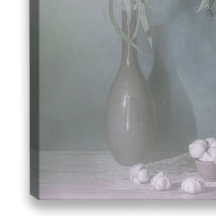 Stilleven met eucalyptus en knoflook in wittinten. makkelijk inpasbaar in de ruimte door zijn wittinten . Ook geschikt als ronde foto, muurbehang,poster.