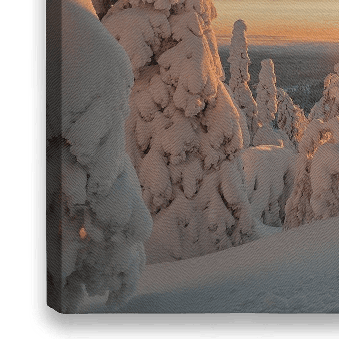 Zonnestralen tussen de besneeuwde bomen door in Fins lapland