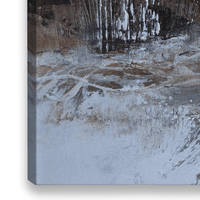 abstract landschap, collage, winterlandschap, acryl, gemengde techniek, blauwtinten, rust, decoratieve muurschildering voor woonkamer, praktijk of kantoor
