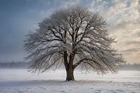 Deze prachtige winterse scène toont een majestueuze boom bedekt met een dikke laag sneeuw, die sierlijk in het stille winterlandschap staat. De takken zijn zwaar van de sneeuw, waardoor ze bijna buigen onder het gewicht. De lucht is een mix van zachte blauwtinten en subtiele grijstinten, wat een serene en rustige sfeer creëert. Dit…