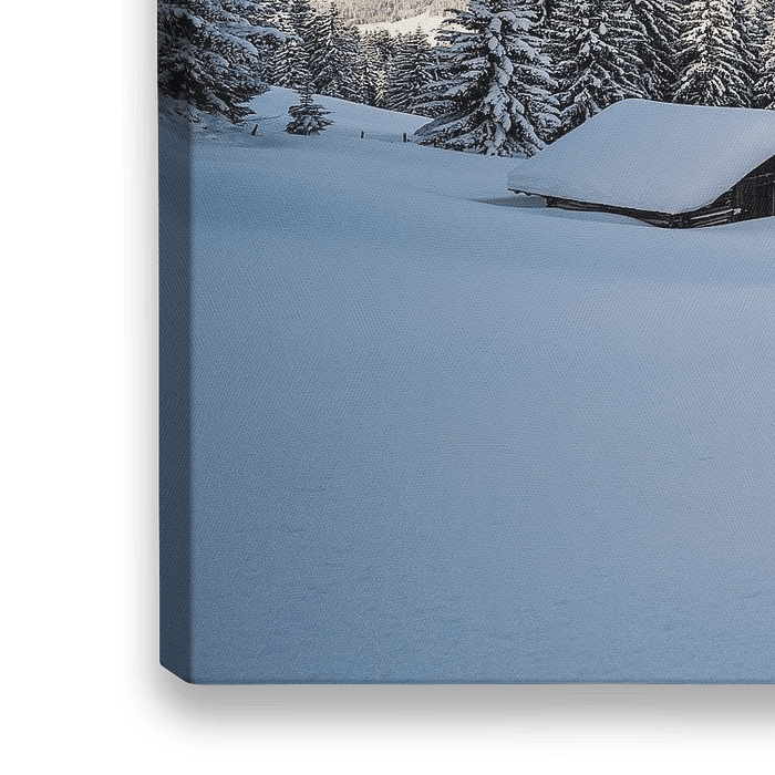 In een winters landschap staat op een lichting in het bos een kleine ondergesneeuwde almhut. Op de achtergrond zijn hoge bergen te zien