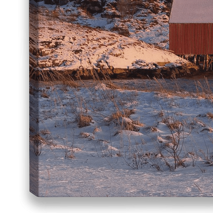 Een winter landschap met bergen en zee. Er staat een rood boothuisje aan de rand van het water. De lucht is blauw en er ligt een dik pak sneeuw. De zon staat laag en belicht nog net een paar stukken van de besneeuwde bergen.