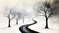 Dit vredige winterlandschap toont een kronkelende weg door een besneeuwde omgeving met kale bomen. De koude kleurschakeringen van de sneeuw en de winterse sfeer brengen een gevoel van rust en eenzaamheid over. De besneeuwde weg slingert elegant door het landschap en nodigt de kijker uit om de schoonheid van de winterse natuur te…
