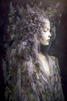 Dromerig fantasie portret van een serene vrouw gehuld in lila wisteria oftewel blauweregen bloesem.