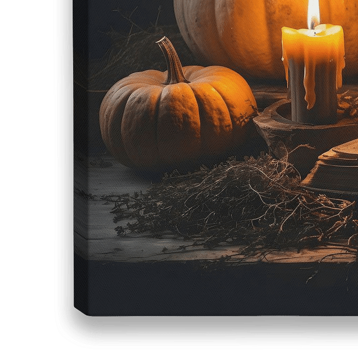 Stap binnen in een betoverend moment, gevangen in stilstaand licht. Witches' Garden Still Life – Herfstmagie is een ode aan de mysterieuze schoonheid van oktober. Pompoenen in warme tinten, oude kruidenbossen en opengeklapte toverboeken vormen samen een stilleven dat fluistert van vergeten spreuken en herfstige rituelen. Het flakkerende kaarslicht accentueert elk detail in dramatisch clair-obscur, waardoor deze compositie tegelijk intiem en magisch aanvoelt.