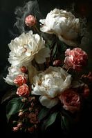 Een compositie van weelderige witte pioenrozen en zalmroze rozen tegen een donkere achtergrond. De bloemen zijn dramatisch belicht en omgeven door een subtiele nevel van rook, wat een mysterieuze, klassieke sfeer creëert die doet denken aan 17e-eeuwse Nederlandse stillevens. De verfijnde belichting accentueert de delicate textuur van de…