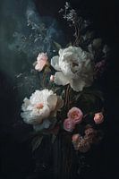 Een dramatisch stilleven waarin witte pioenrozen en zachte roze rozen tegen een diepdonkere achtergrond tot leven komen. De bloemen lijken te zweven in een mystieke sfeer, waarbij subtiele rookeffecten een etherische dimensie toevoegen aan de compositie. Het spel tussen licht en donker creëert een tijdloze, romantische sfeer die doet…