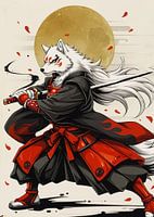 White Wolf Samurai met zwart rood pantser en katana onder de maan