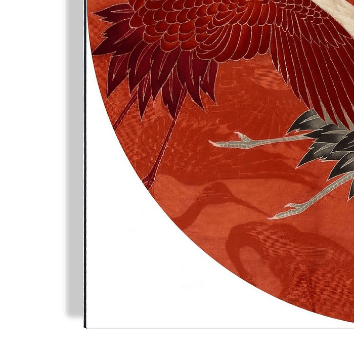 Over ‘Witte en rode kraanvogels op warm rood zijde [rond]’ van Affect Fotografie