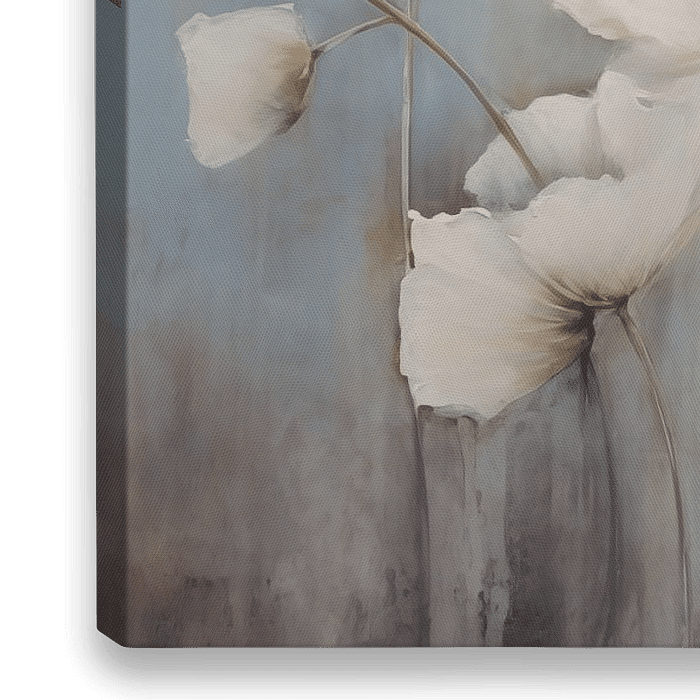 Een digitale bewerking van witte klaprozen op een grijs en licht blauwe achtergrond. Met hier en daar wat beige tinten.