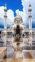 Een majestueuze witte moskee met hoge minaretten en een sierlijke koepel wordt weerspiegeld op natte bestrating onder een bewolkte hemel. De scène straalt rust en eerbied uit - ideaal voor Ramadan- of Eid-afbeeldingen.