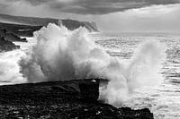 De Atlantische Oceaan slaat hoge golven hier aan de kust van Lissabon, niet ver van Praia das Macas. Ondanks hun kracht zijn ze niet te vergelijken met de spectaculaire monstergolven van Nazaré in de winter.