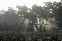 Landschap in de bossen van de Wolfhezerheide in Doorwerth. Het is een prachtige en mistige ochtend en de opkomende zon zorgt voor mooie stralen.